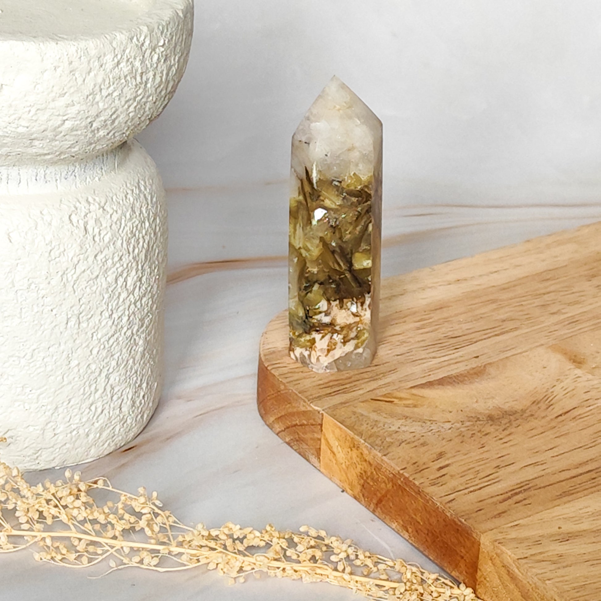 Le mica doré diffuse une énergie lumineuse qui attire optimisme et confiance en soi.